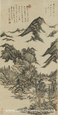 清 王原祁 仿古山水 纸本设色 首都博物馆藏 王原祁(1642-1715),字茂京,号麓台,江苏太仓人,康熙九年(1670年)进士,官至户部侍郎,以画供奉内廷,鉴定古今名画。康熙四十四年(1705年)擢侍讲学士,转侍读学士,值南书房,充《佩文斋书画谱》纂辑官。为清代著名山水画家,清初正统画派的领军人物,与王时敏、王鑑、王翚并称“四王”。 款题:精神老向墨花闲,梦想挥毫高米间。写到云峰舒卷处,浓阴密雨掩青山。余纂辑《御制书画谱》,见大米小米房山论画,觉有所得,兴会融洽,因作是图,并系断句。己丑(1709年)秋日,王原祁。 画家钤印:御书画图留与人看(朱白)、王原祁印(白)、麓台(朱)、西庐后人(白) |