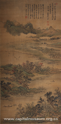 清 王翚 仿赵大年青绿山水 绢本设色 首都博物馆藏 王翚(1632-1717),字石谷,号耕烟散人、清晖主人、乌目山人,江苏常熟人。曾奉旨作《康熙南巡图》,御赐“山水清晖”四字。为清代著名山水画家,清初正统画派的领军人物,与王时敏、王鑑、王原祁并称“四王”。 款题:点点沙鸥下渚田,荒荒渔舍隐溪烟。夕阳柳岸收鱼网,秋水萍花放鸭船。壬辰(1712年)小春,耕烟散人王翚。赵大年画平远,绝似右丞,秀润天成者,亦宋之士大夫画此一派。又传为倪云林。云林工致不敌而荒率胜矣。向在晋陵唐氏获见真迹,而尺幅之中备极渺茫之致,使人玩之不穷,味外有味,闲窗追忆,偶为摹此,未识风规有合否耶?石谷子又识。 画家钤印:海虞(朱)、耕烟(朱)、王翚之印(朱)、清晖老人时年八十有二(白) |
