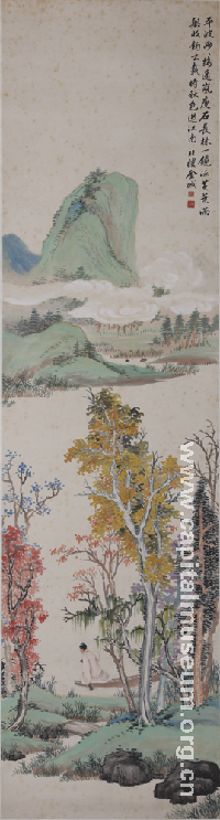 民国 金城 山水 纸本设色 首都博物馆藏 金城 (1878—1926),原名绍城,字拱北,号北楼,又号藕庐、藕湖渔隐,斋号墨茶阁,浙江湖州人。幼即嗜画,精于摹古,工山水、花鸟各科。1913年,他作为议员,曾倡议成立“古物陈列所”,保存和展览古代文物,是中国文博事业的先驱者;1920年以后发起成立“中国画学研究会”,并筹办多次中日绘画联合展览。 款题:平波渺渺接遥岚,瘦石长林一镜涵。黄叶满船收钓去,载将秋色过江南。北楼金城。 画家钤印:金城(白)、巩伯(白) |