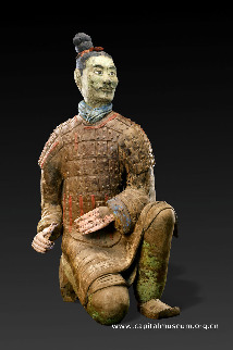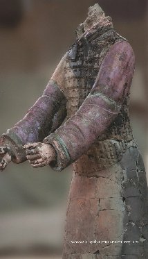 兵马俑表面原本施有明艳的彩绘,其彩绘底层的主要成分为生漆,制作工艺及对环境变化的剧烈反应导致其出土时迅速卷曲起翘而脱落,极难保存。新材料的研发结合特定的加固技术,得以使这些彩绘陶俑以本色示人。 |